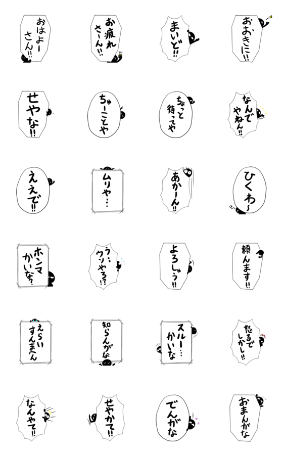 日常会話でよく使う関西弁のスタンプです! 関西弁でツッコミや挨拶をしてみてはいかがでしょうか。 さりげなくくっついているキャラにも注目です!