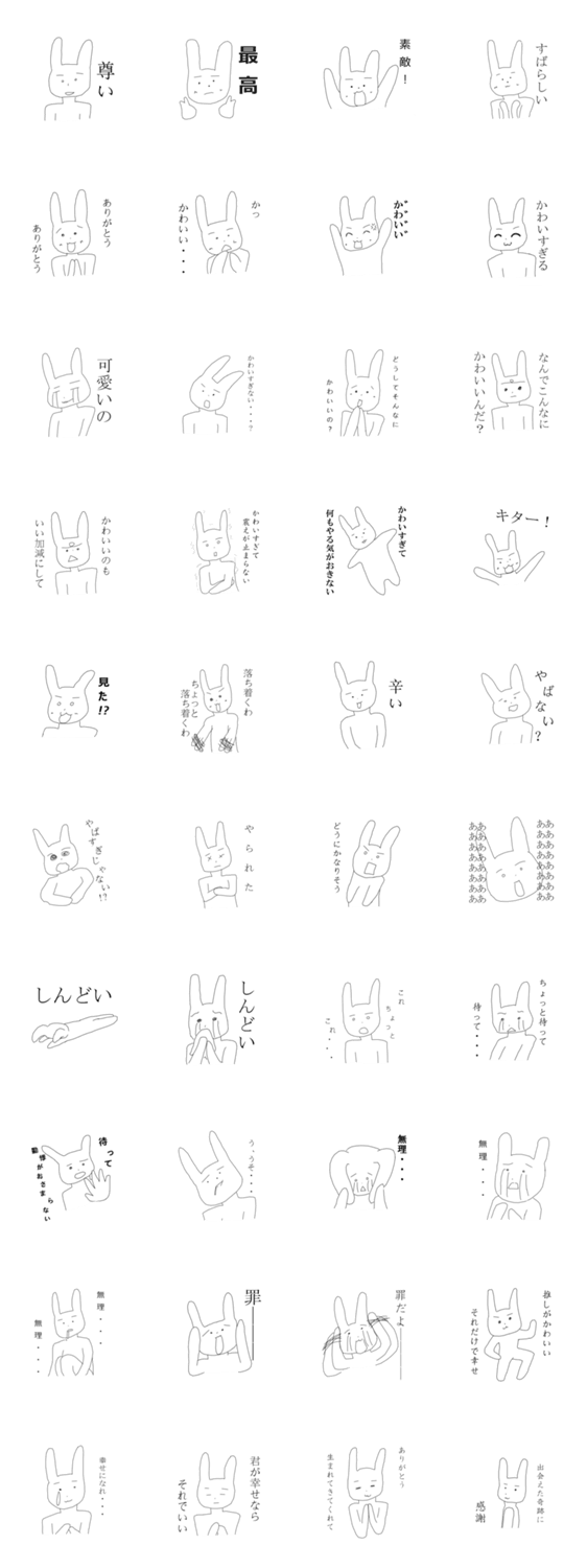 尊い、かわいい、やばい、無理、辛い…語彙力のないオタクなうさぎのスタンプです。顔面も体も崩壊気味。 推しの萌え語りの際にどうぞ!