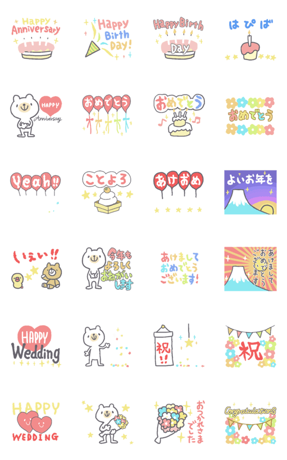 おめでたい時に使う動くイベントスタンプ。誕生日や結婚祝い、新年の挨拶も色々入った詰め合わせ。