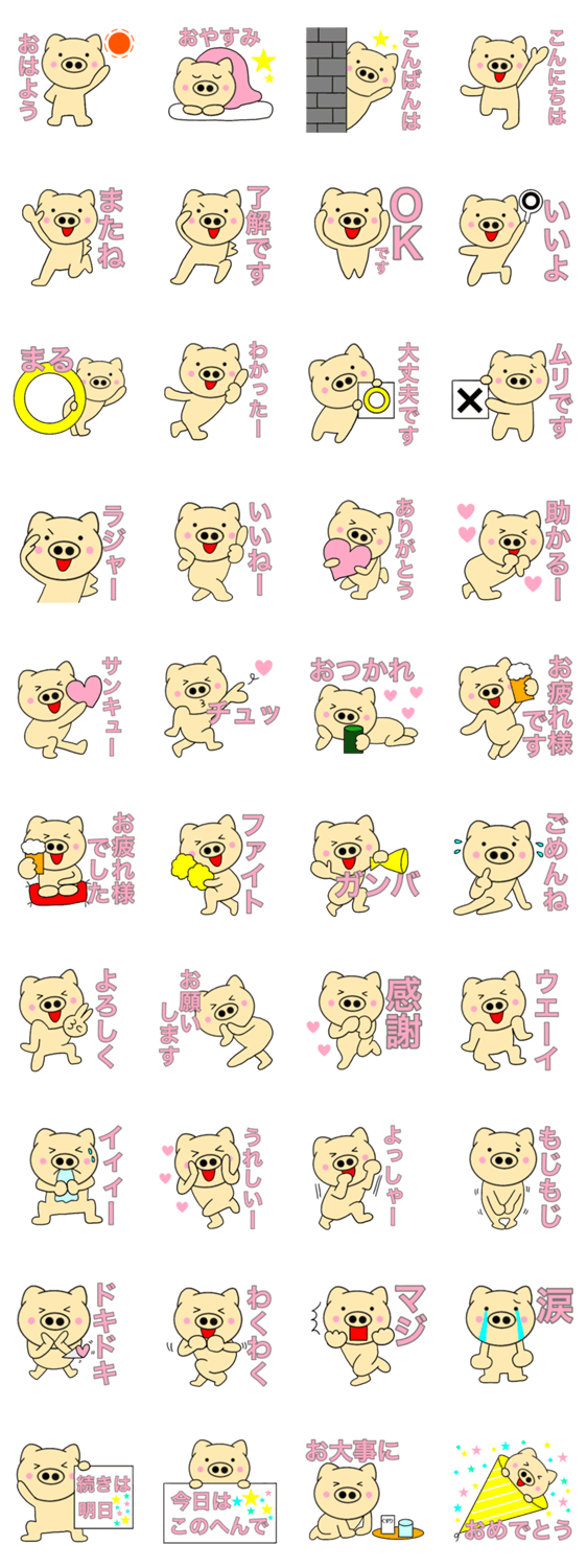 良く使う言葉を集めた、毎日使えるシンプルで可愛いブタのスタンプです。