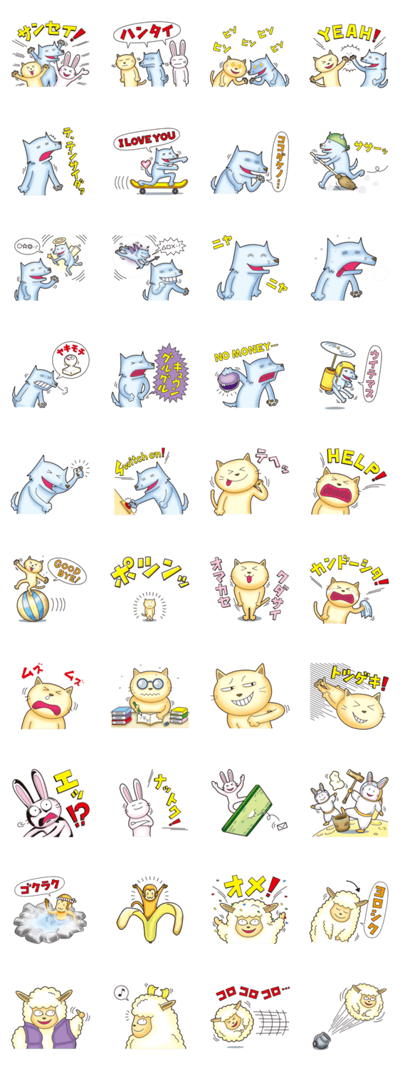 チェキチェキによる動物ゆるキャラスタンプ第3弾!いつものメンバー、チョーベエ・猫・兎に加えて今回は猿と羊が登場!みんなまとめてかわいがってあげてください。