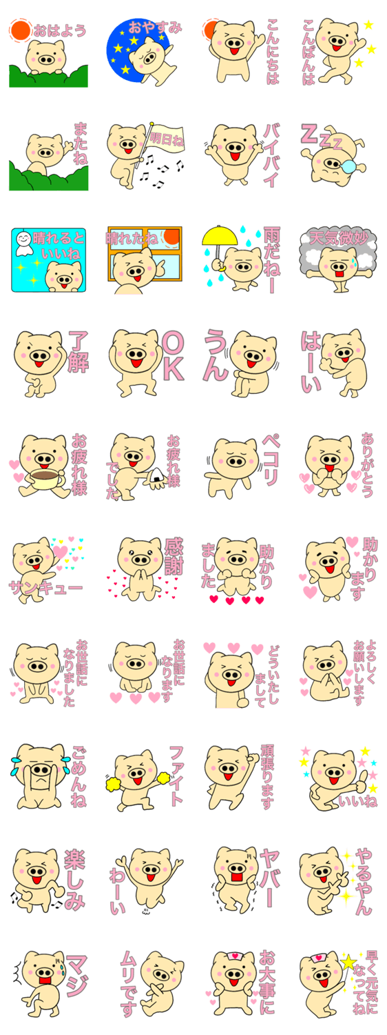 良く使う言葉を集めた、毎日使えるシンプルで可愛いブタのスタンプです。