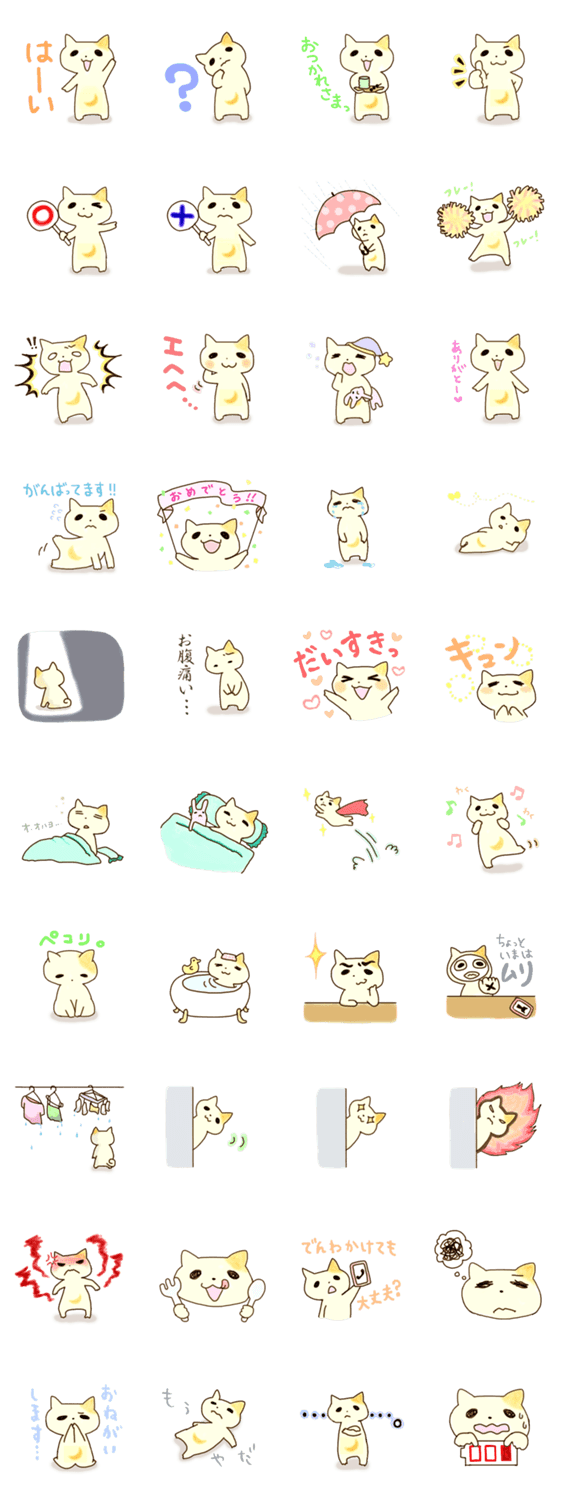 「つきのわねこ」は、たれ目でちょっぴりマイペースな猫です。チャームポイントはおなかの月マーク。
