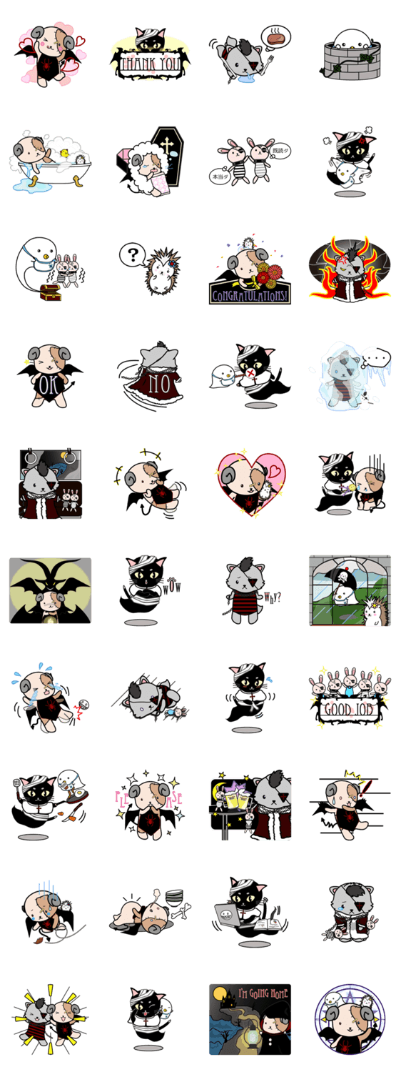 千年たったら魔王になれる!?ちっちゃな悪魔王子シームと、ゴーストやネコ、ハリネズミなどかわいい仲間たちの、ちょっぴりダークでゴシックテイストなスタンプです。