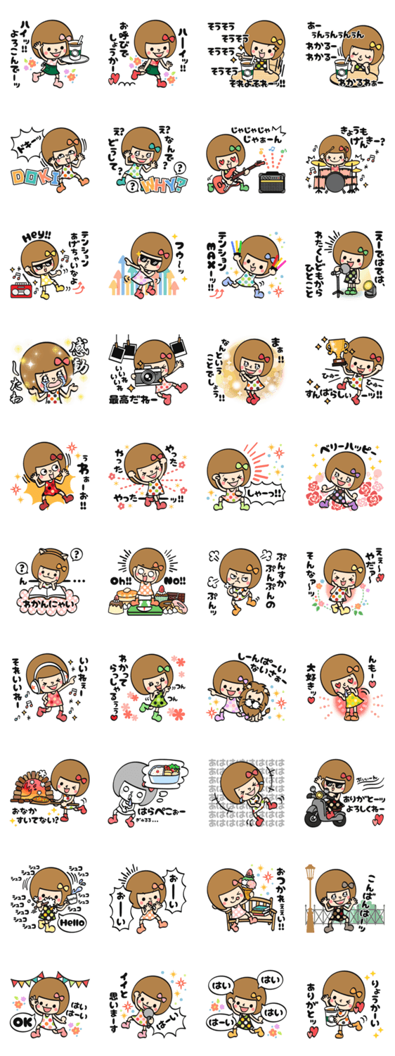 ハイテンションなスタンプが盛りだくさん。元気のないあの子へ、元気のあるあの子にも、是非送ってみてください。おかっぱリボンの女の子。
