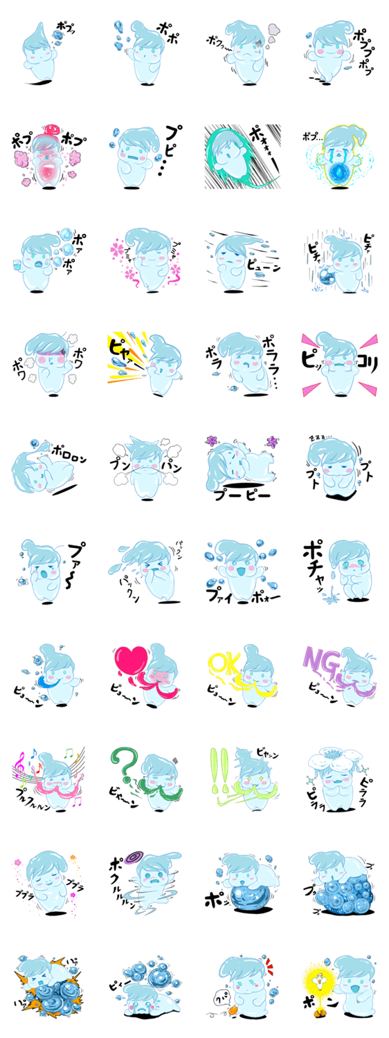 震える水の命。ポプパピクパポンが、言葉になりたがらない言葉に寄り添います。ポプポプ、ポラポララなど水と泡の音をイメージ。プチ和みをスタンプで楽しんで下さい。