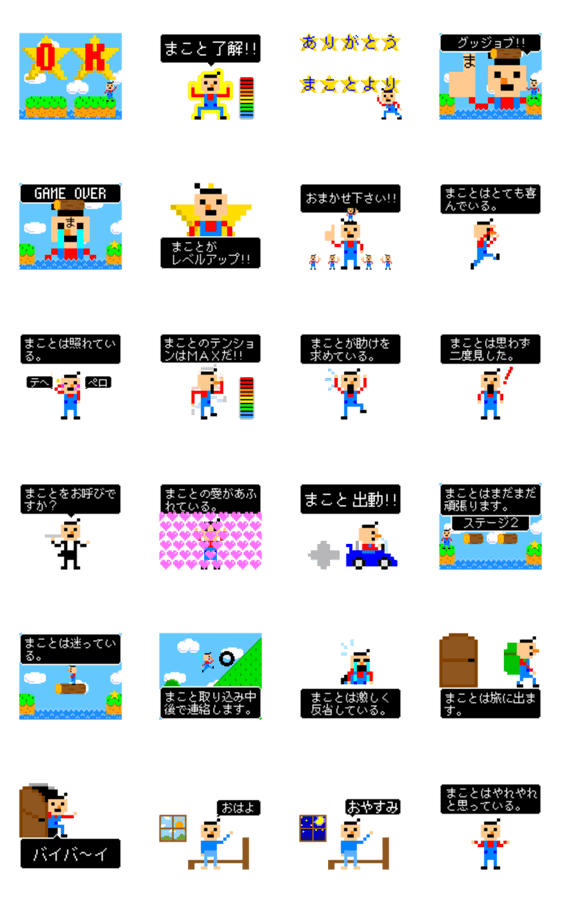 | スタンプ説明 | 動く名前スタンプシリーズの「まこと」(誠、真、信...等々)専用です。8ビットレトロゲーム風の使いやすいスタンプです。 |