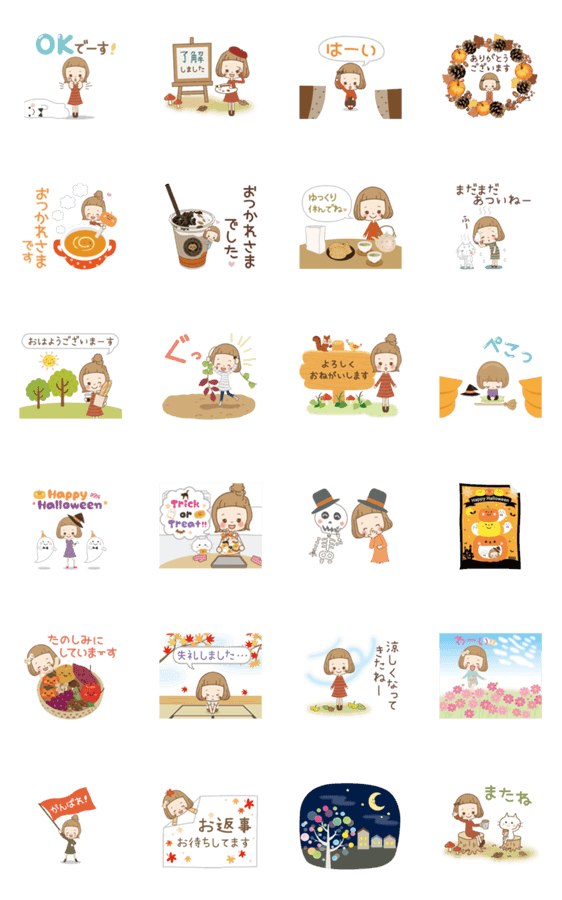 前髪短めな女の子の動くスタンプ第12弾は「秋のゆる敬語」です。 ハロウィンや紅葉など、秋に使える季節感たっぷりなスタンプです。 毎日の会話にどうぞ。