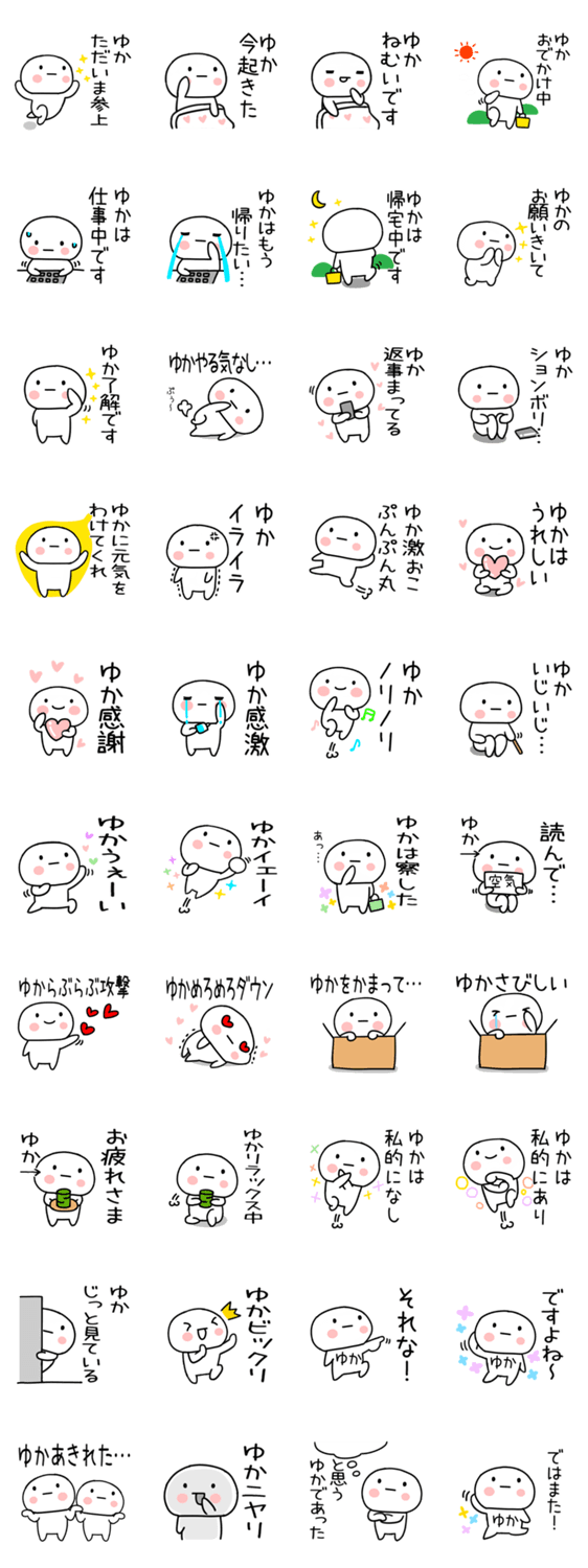 毎日使える日常会話くんの名前バージョンです。 ゆか、ゆかり、ゆかな、ゆかさ、ゆから、など名前に「ユカ」がつく人につかえます。しろくてまるいキャラクターです。
