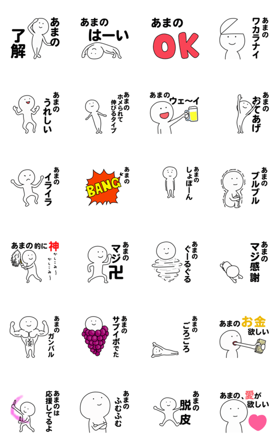 ちょっぴりシュールで素朴なアニメーション名字(苗字)名前スタンプ。 アマノ,天野,海野,尼野,雨野,天埜,甘野,阿万野,海士野,阿萬野,甘濃,海部野, etc.