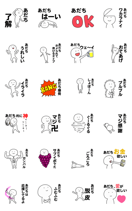 ちょっぴりシュールで素朴なアニメーション名字(苗字)名前スタンプ。 アダチ,安達,足立,足達,安立,阿達,芦立,安逹,阿立,明立,芦達,阿太地,安舘,愛多地,安館,足逹, etc.