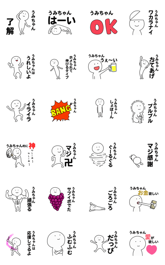 ちょっとシュールなアニメーションあだ名(ニックネーム)一人称名前スタンプ。 うみ,うみと,うみか,など