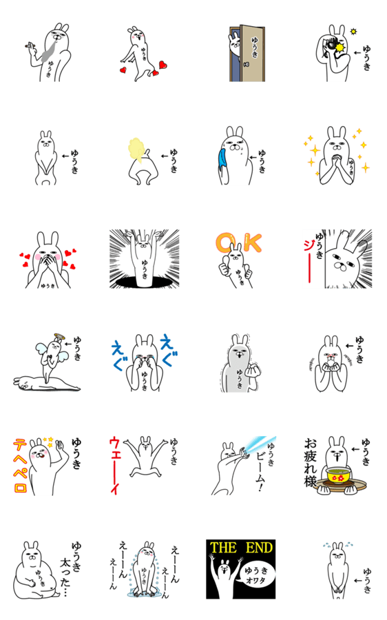 ゆうきが使える名前スタンプ。ゆうき,勇気,雄貴,優希,祐希,裕貴,勇希,悠希,友樹,祐樹,有希,勇輝,佑樹,裕樹,勇樹,ユウキ。ゆうきさんみんなが使えて送れる名前スタンプ。
