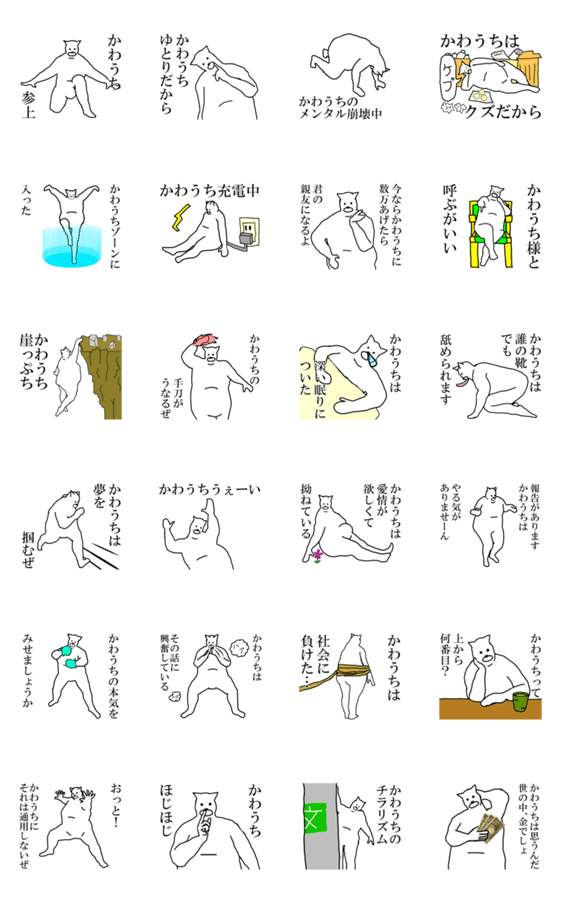 自分の名前に、【かわうち】が付く人専用のアニメーションスタンプです。かわうち、カワウチ、河内、川内等々。