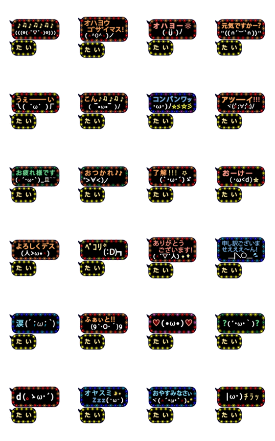 吹き出しの動く顔文字、お名前スタンプ「たい」様専用☆イルミネーションでより楽しく気分を盛り上げて下さい♪アニメーション、敬語、日常、ネオン☆毎日使う基本編