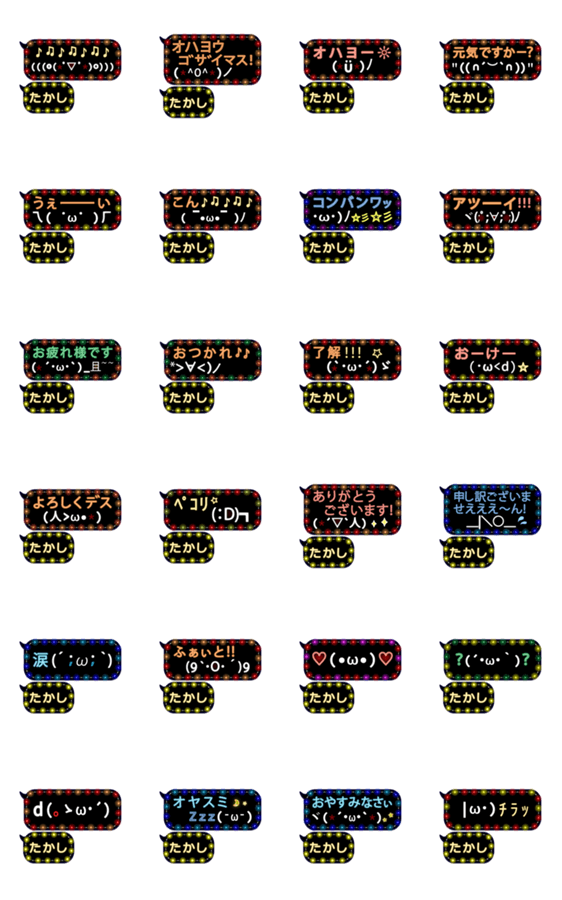 吹き出しの動く顔文字、お名前スタンプ「たかし」様専用☆イルミネーションで楽しく~♪アニメーション、日常、ネオン☆毎日使う基本編。イルミ「○○」で検索してね☆