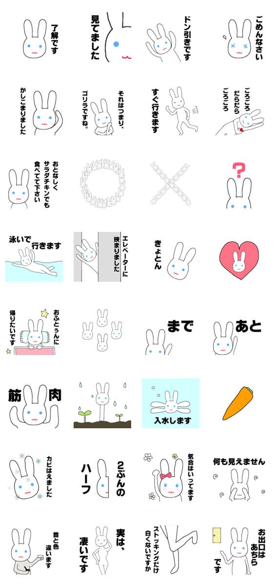 しろさんはかわいいウサギです。たまーにおかしな事を言います。 敬語なので職場の人、年上、年下にも使えます。毎日使いやすいスタンプです。