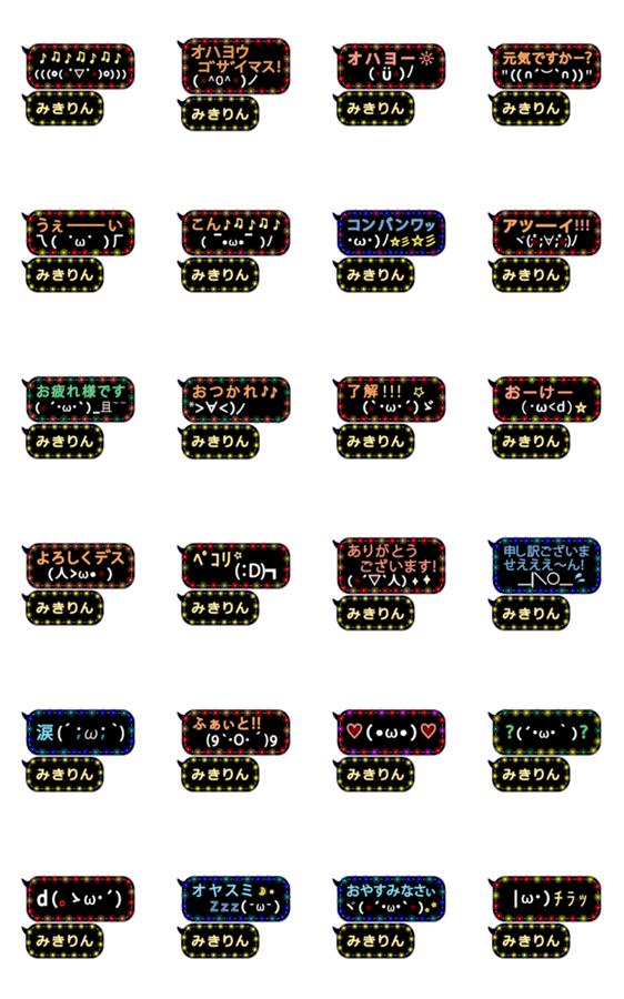 吹き出しの動く顔文字、お名前スタンプ「みきりん」様専用☆イルミネーションで楽しく~♪アニメーション、日常、ネオン☆毎日使う基本編。イルミ「○○」で検索してね☆