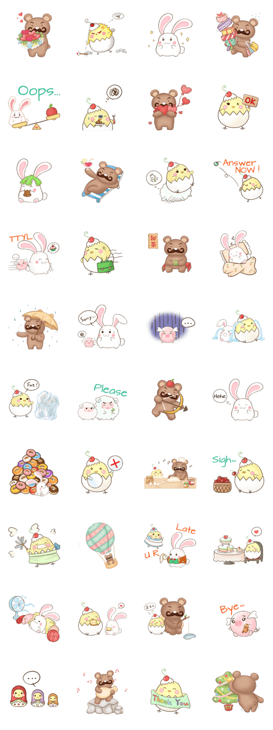 | スタンプ説明 | Master Beard loves to cook with natural ingredients and shares with his friends, Cherry Chicken, do do bunny, glassy piggy, and no no sheep. |