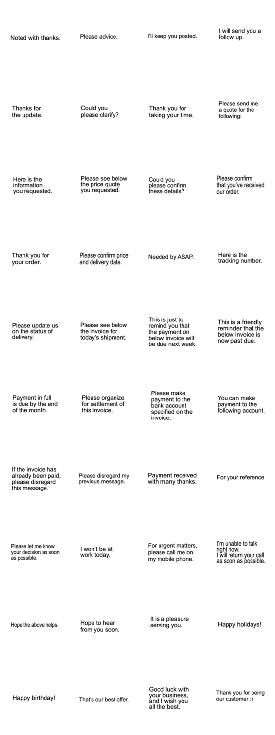 | スタンプ説明 | Formal useful business sentences in English language. Good for clients, customers, suppliers, vendors, colleagues, co-workers, office, work place. |