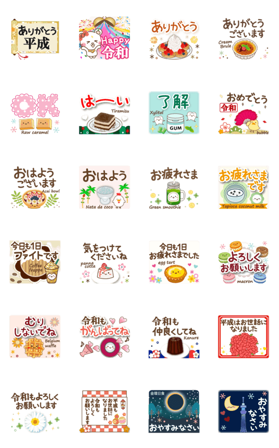 | スタンプ説明 | ティラミス、ナタデココ、パンナコッタなど、平成の懐かしいスイーツや食べ物にちなんだスタンプです♪新元号の挨拶にも、日常にも使えます! |