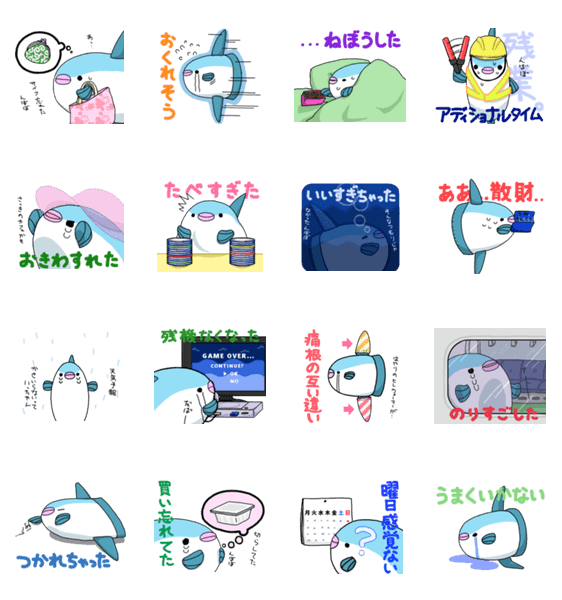 日頃感じてしまう気持ちをちょっぴり弱気なマンボウきゅんが代弁してくれるスタンプです。