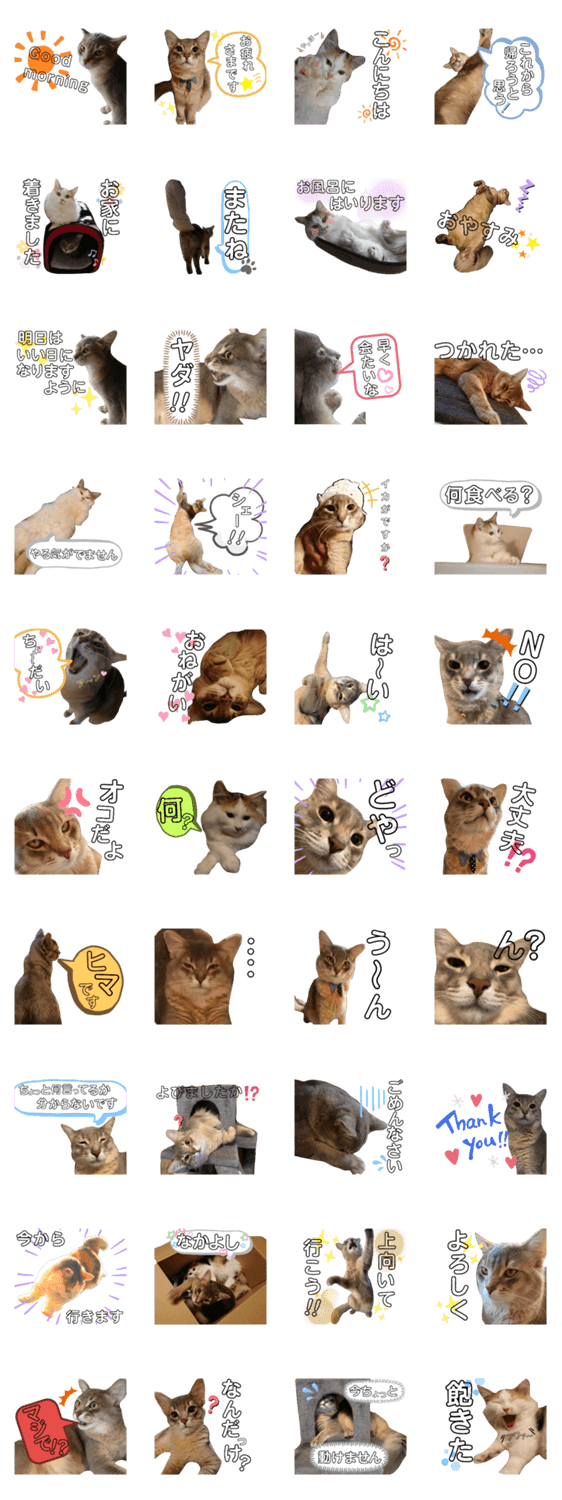 武丸(ソマリ)と、時々きな粉餅(メインクーン)のスタンプです。自己満足で作りましたが、使って貰えると嬉しいです。