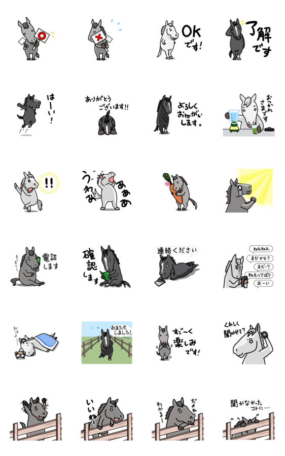 黒・グレー・白の芦毛のお馬さんが動くスタンプ