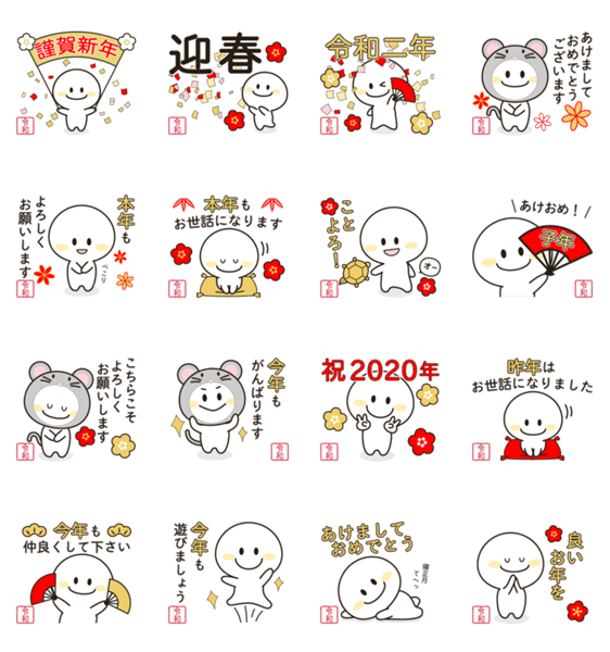 2020年、令和二年のお正月に使えるスタンプです。しろくてまるいかわいすぎないキャラで世代問わず大人の方も無難に使えます。元旦/元日/年越し/正月/お祝い/令和