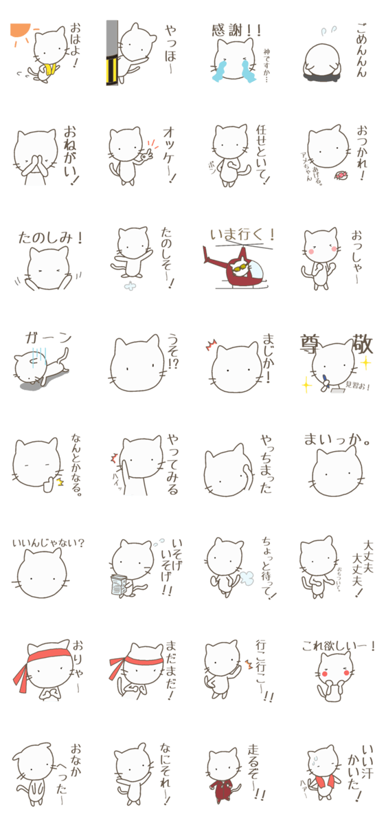 しろねこさんスタンプ、ポジティブさんVer.です。前向きに突き進むそのエネルギーを、しろねこさんがゆるっと伝えます。