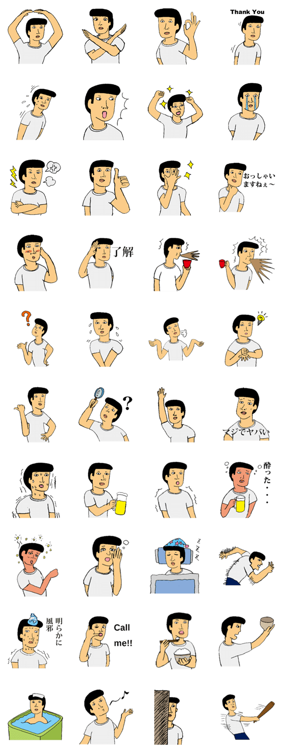 | スタンプ説明 | 無表情なキャラクター、M氏がLINEスタンプでなんとか感情を表現しようとしています。微妙な感情を表現したいときにお使いください。 |