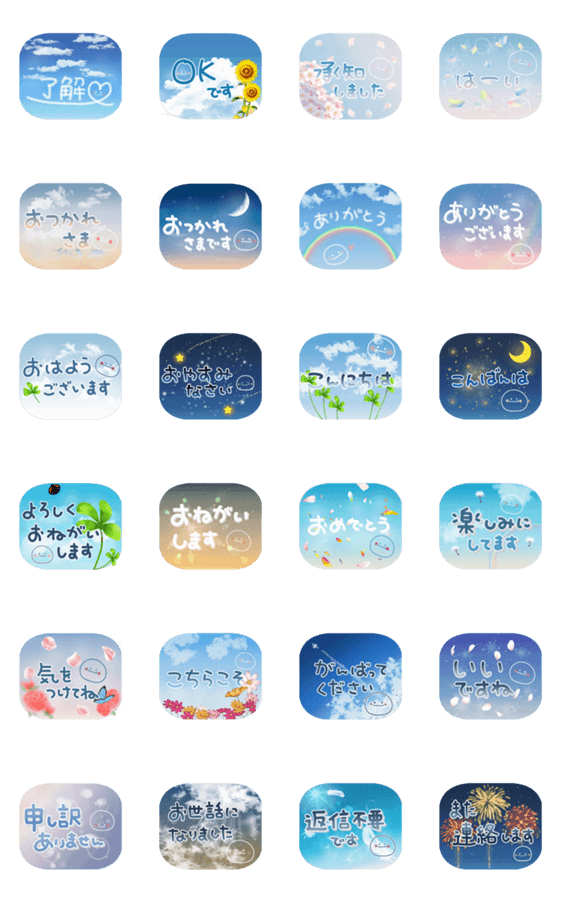 いろんな空にメッセージとにこちゃんが浮かび上がる、大人かわいい動くスタンプです。