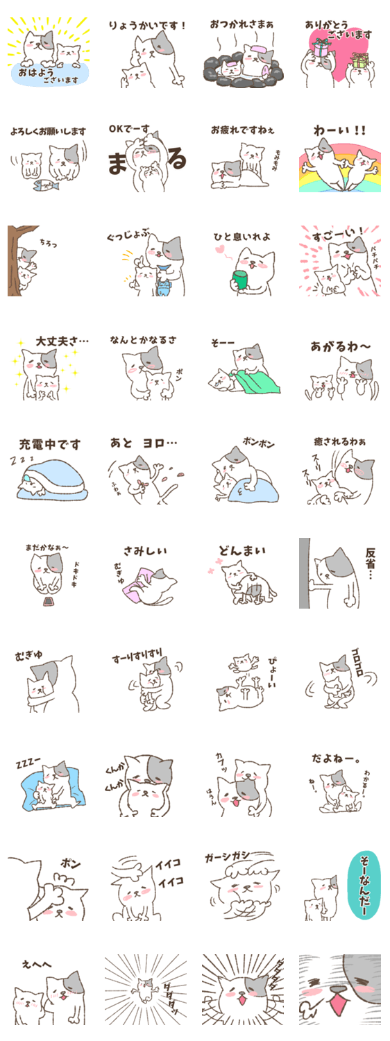 ぶち猫のぬっこと白猫のもっこの2匹が、癒してくれたり、応援してくれたり、甘やかしてくれるスタンプです。