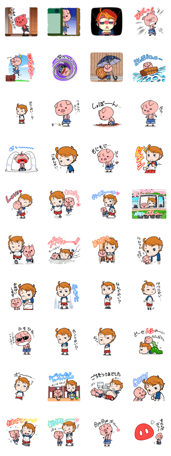 少年「やい」とその兄で自分は人間だと言い張るこぶたの「ぶう」のスタンプ第2弾です。どう見てもブタにしか見えませんが、たぶんブタです。さらに表情豊かになりました。