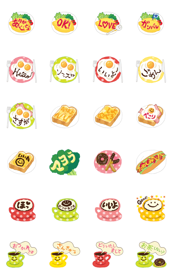 おいしそうなケッチャップの文字が オムライスに書かれていくスタンプ。 その他、ソース、ハチミツ、マヨネーズなどで書かれた面白い、日常会話で使いやすいスタンプ。