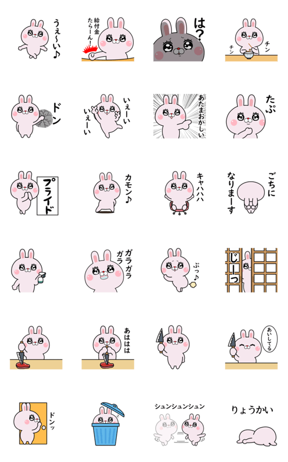 煽りたいうさぎのラピピの動くスタンプ第3弾です。コロナウイルス感染予防を訴える除菌やうがい、給付金ネタ。