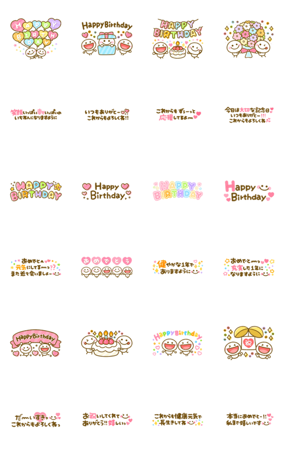 省スペース仕様のHAPPYBIRTHDAYの文字やお祝いの言葉などを組み合わせて何通りものオリジナルお祝いメッセージを作れます♡ゆるかわ棒人間もいっぱい♡