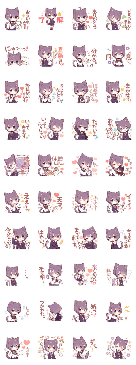 黒猫少年や白猫少年たちの新しいお友達、ロシアンブルーの猫少年スタンプ第二弾です。毎日使える挨拶や日常会話、リアクションが沢山入っています。