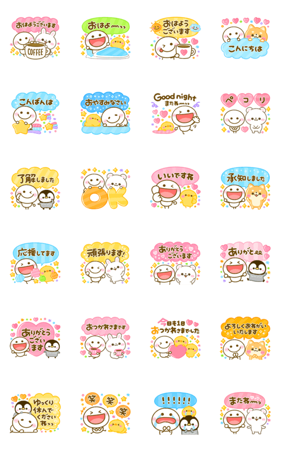 ゆるかわ棒人間、ぴよこ、うさぎのほいっぷ、くまぺん、豆柴が大集合♡明るい気持ちになれるカラフルなスタンプです♪敬語もいっぱい♡