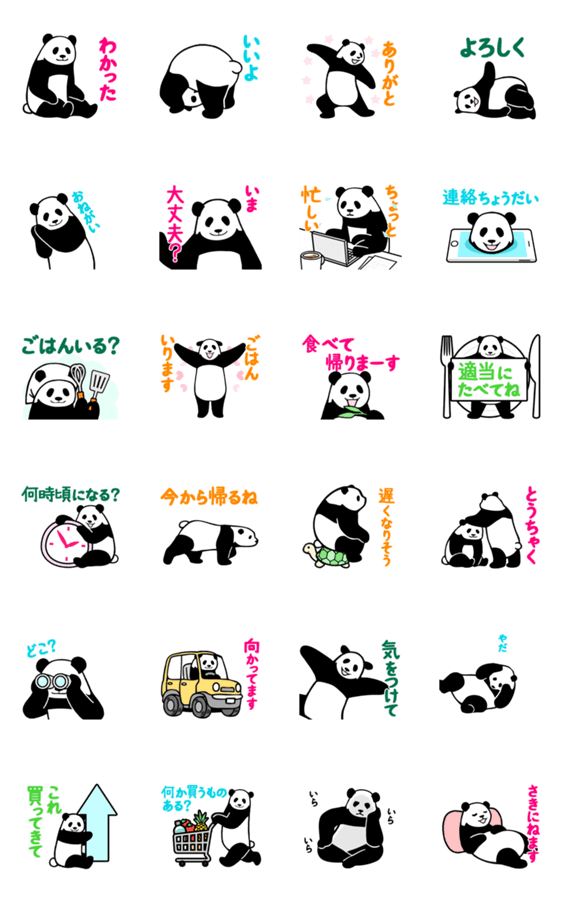 | スタンプ説明 | パンダンの動くスタンプ、家族連絡用です。特にお母さん・ママがよく使うメッセージがたくさん入っています。家族はもちろん友人、カップルにも使えます |