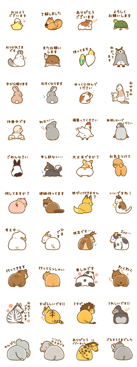 かわいいおしりの癒しのスタンプを、日常でよく使う言葉で作ってみました。 友達や家族など色々な方々にも使いやすいスタンプになっています。