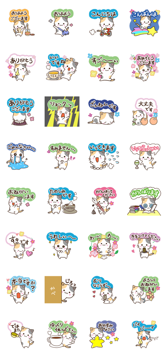 『お茶目な三毛猫』スタンプから『敬語』編です。基本的な言葉や、使いやすい丁寧な言葉を集めました。ねこ好きな方にぜひ。【かたこ】