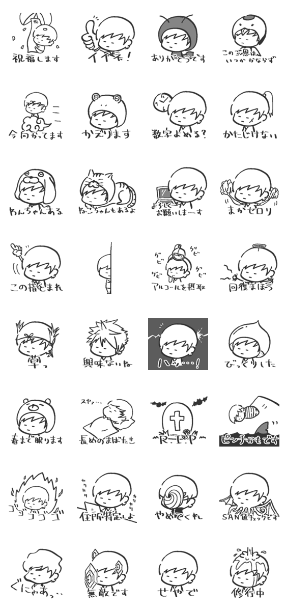 やっくん(制作者)をモデルにしたスタンプの第二弾です。 僕が言いそうなセリフとかいう設定はわりと無視して、使いやすそうなものを描きました。