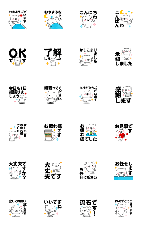 | スタンプ説明 | 飛び出すスタンプ/ポップアップ/毎日使える/日常会話/使いやすい/シンプル/大人/老眼/おじいちゃん/おばあちゃん/老人/敬語/敬老/デカ文字/ねこ/ネコ/にゃんこ/猫 |
