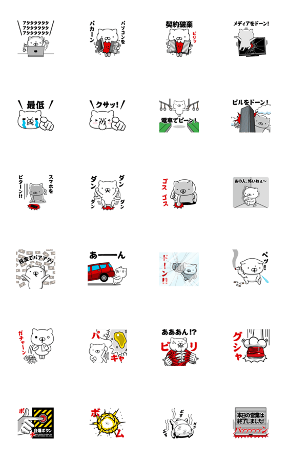 | スタンプ説明 | 飛び出すスタンプ/ポップアップ/ストレス社会/ストレス発散/煽り/怒り/爆発/ウザい/恐怖/イライラ/叫び/破天荒/暴れる/家族/恋人/友人/同僚/友達/ストレス解消 |