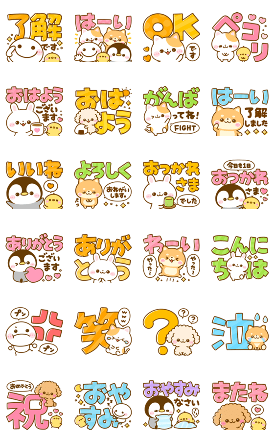 棒人間、ぺんぺん、うさぎのほいっぷ、豆柴日和、といぷーが大集合♡見やすいデカ文字が大人可愛く飛び出すポップアップスタンプです。 柴犬 トイプードル ペンギン敬語