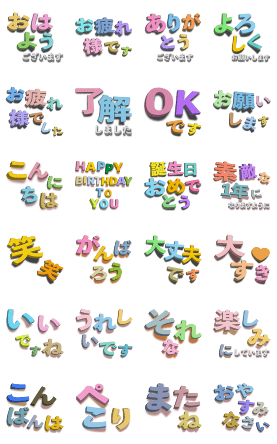 画面いっぱいに広がる大きな文字だけのスタンプです。敬語が多くキャラクターもいないので可愛すぎず無難に誰にでも使える♪使用頻度の多い言葉だけを厳選しました。