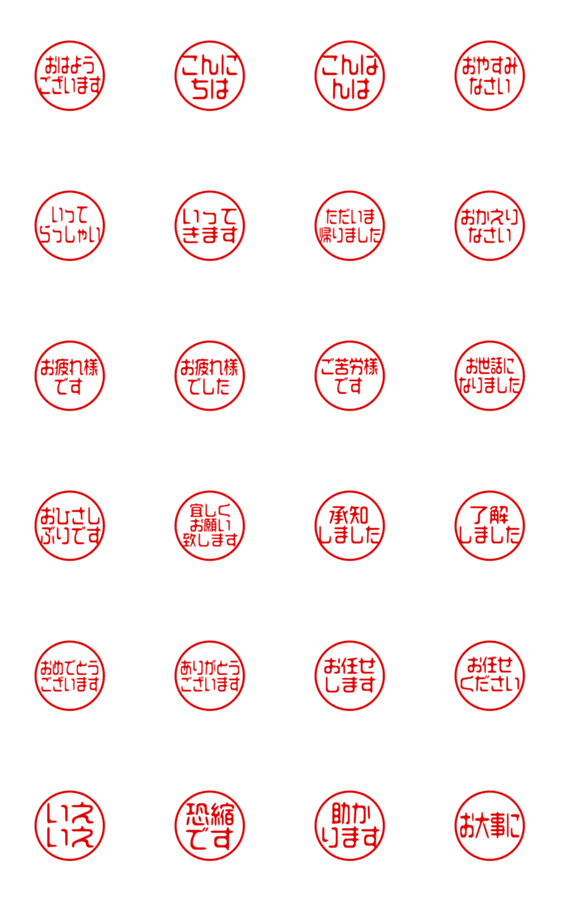 | スタンプ説明 | ハンコ/はんこ/判子/いんかん/スタンプ/お名前/アダ名/あだ名/なまえ/印鑑/家族/友達/恋人/社長/部長/課長/係長/お父さん/お母さん/日常会話/毎日使える/会社/上司/大人 |