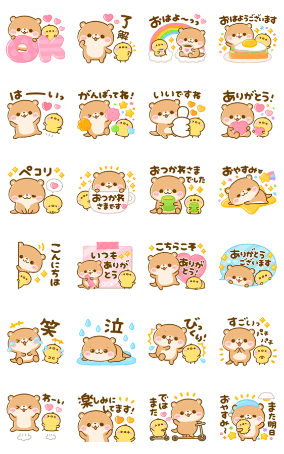 コツメカワウソとぴよこがカラフル可愛く飛び出す! 毎日使えるポップアップスタンプです。かわうそちゃんアニメーションスタンプバージョンもあります。