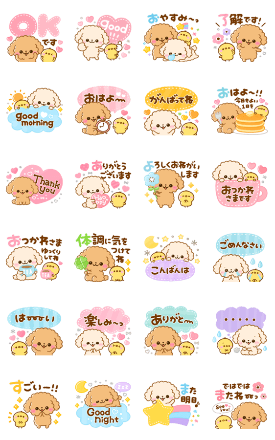 ふわふわもこもこの犬♡トイプードル、モカちゃんとラテくんの毎日使えるポップアップスタンプです♪